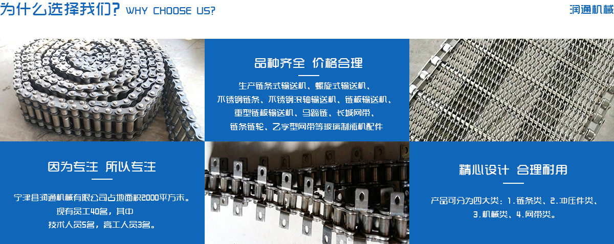 生產(chǎn)鏈條式輸送機(jī)、螺旋式輸送機(jī)、不銹鋼鏈條、不銹鋼滾軸輸送機(jī)、鏈板輸送機(jī)、重型鏈板輸送機(jī)、馬蹄鏈、長城網(wǎng)帶、鏈條鏈輪、乙字型網(wǎng)帶等玻璃制瓶機(jī)配件,食品機(jī)械配件及各種網(wǎng)帶的專業(yè)廠家 ,多年來產(chǎn)品暢銷各地玻璃廠和食品廠,在玻璃制品等行業(yè)中享有較高的聲譽(yù)。公司集摸具開發(fā)、機(jī)械設(shè)計生產(chǎn),銷售于一體的生產(chǎn)型企業(yè)。生產(chǎn)的自動化流水線金屬傳動網(wǎng)帶、鏈條等產(chǎn)品廣泛用于玻璃機(jī)械、食品機(jī)械、化纖機(jī)械、醫(yī)藥、電子、烘干機(jī)械、輪胎機(jī)械等行業(yè)。產(chǎn)品多銷往各個城市的機(jī)械廠、食品廠和一些涉及流水線或自動化設(shè)備的公司。